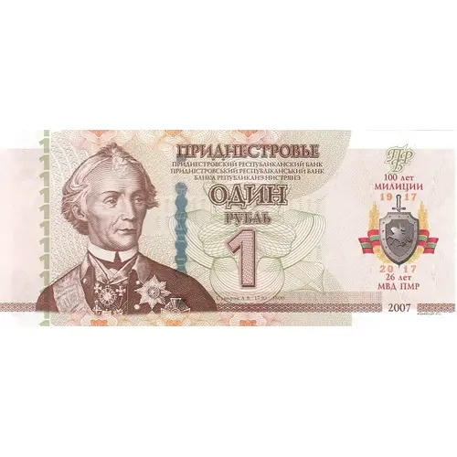 | Obverse lettering | ПРИДНЕСТРОВЬЕ ПРИДНЕСТРОВСКИЙ РЕСПУБЛИКАНСКИЙ БАНК ПРИДНІСТРОВСЬКИЙ РЕСПУБЛІКАНСКИЙ БАНК БАНКА РЕПУБЛИКАНЭ НИСТРЯНЭ ОДИН РУБЛЬ 1 100 лет МИЛИЦИИ 19 17 20 17 26 лет МВД ПМР (Translation: Transnistria, Transnistrian Republican Bank, One Ruble, 100 years of Police, 26 years of Ministry of Internal Affairs of Transnistria) |