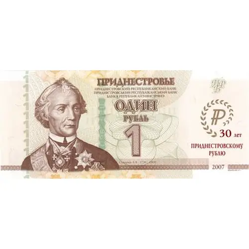 | Opschrift keerzijde | 1 ОДИН РУБЛЬ ПОДДЕЛКА БИЛЕТОВ ПРИДНЕСТРОВСКОГО БАНКА ПРЕСЛЕДУЕТСЯ ПО ЗАКОНУ (Translation: One Ruble, Forgery of the banknotes of the Bank of Transnistria is punishable by law.) |