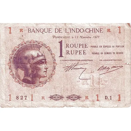 Potrait of helmeted woman at left. Bank of Indochina (Pondichery) 1 Roupie (Rupee) payable on demand to the bearer. |