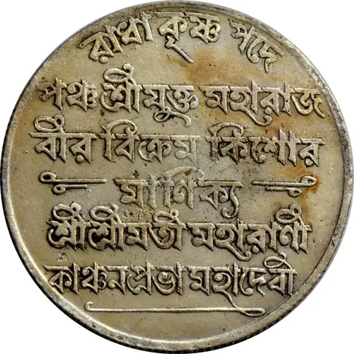 | Beschrijving voorzijde | Legend in Bengali: Radha Krishn Padh (curved letters at the top) Panch Shri Yukta Maharaj Vir Vikram Kishore Manikya (between parallel lines) Shree Shreemati Maharani Kanchan Prabha Mahadevi |