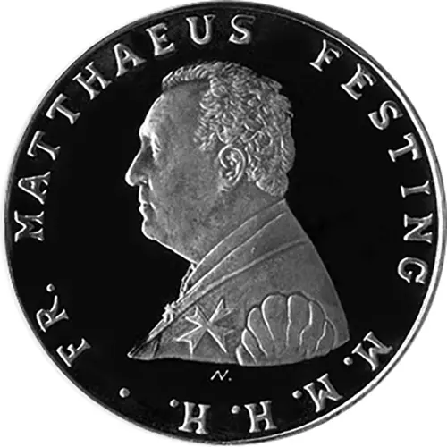 توضیحات روی سکه Portrait of Fra` Matthew Festing, 79th Prince and Grand Master of the Sovereign Military Hospitaller Order of St. John of Jerusalem of Rhodes and of Malta.