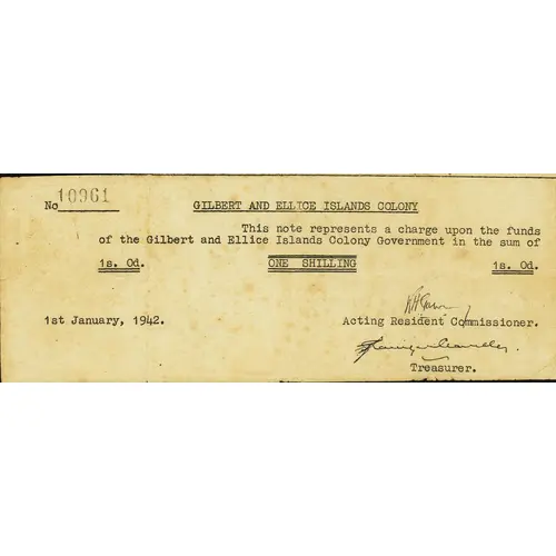 | 表面の銘文 | GILBERT AND ELLICE ISLANDS COLONY THIS NOTE REPRESENT A CHARGE UPON THE FUNDS OF THE GILBERT AND ELLICE ISLANDS COLONY GOVERNMENT IN THE SUM OF ONE SHILLING |