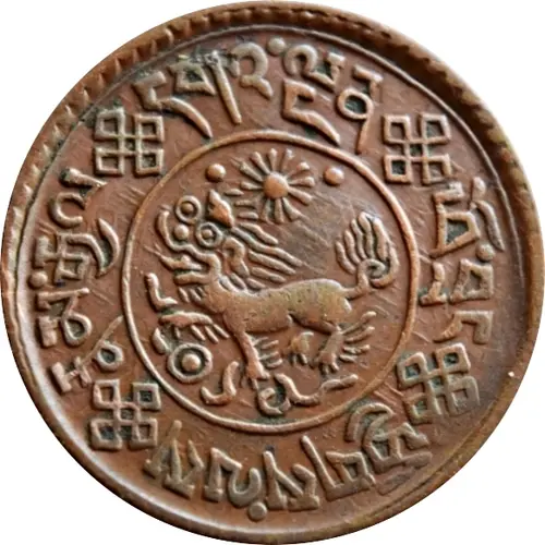 | Opis awersu | Snow lion facing left with sun above and scroll ornaments around, all surrounded four identical Buddhist auspicious symbols (an endless knot) and Tibetan characters. |