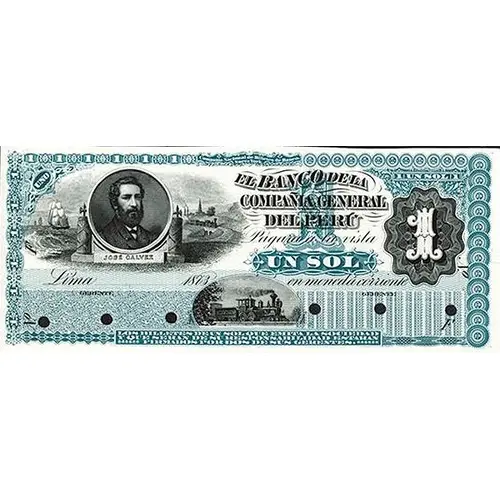 Vorderseitenlegende UNO UN SOL el BANCO de la COMPAÑIA GENERAL DEL PERÚ pagará a la vista UN SOL en moneda corriente JOSÉ GALVEZ Lima ___________1873 GERENTE GERENTE LOS BILLETES DE UN SOL QUE EMITA LA SOCIEDAD Y QUE SERÁN DE SU RESPONSABILIDAD ESTARÁN FIRMADOS POR DOS DE SUS GERENTES.