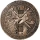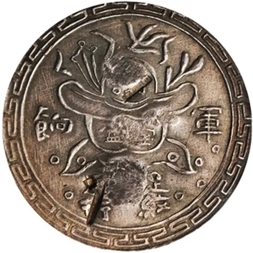 Crossed brashes with lotus flowers surrounded by Chinese ideograms (with one incused above and below).