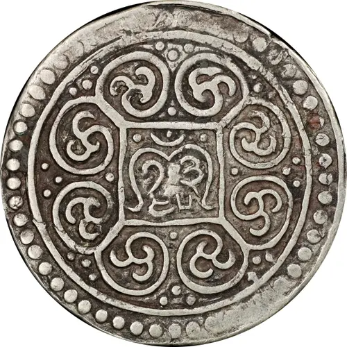 | Описание реверса | Ornate lotus design within double circle surrounded by the Buddhist Eight Auspicious symbols (a white parasol, a conch shell, a treasure vase, a victory banner, a dharma wheel, a pair of golden fish, an endless knot, and a lotus flower) within the petals of an eight-petalled lotus. |