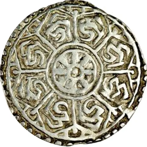 | Descrizione del rovescio | Wheel within double circle surrounded by Vartula characters within the petals of an eight-petalled lotus. |