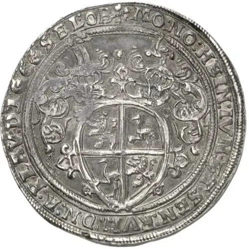 | Description de l’avers | Ornate oval shield, two helmets above. |