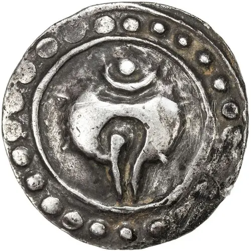 | Описание реверса | Angular srivatsa with swastika to the left and bhadrapitha to the right. |