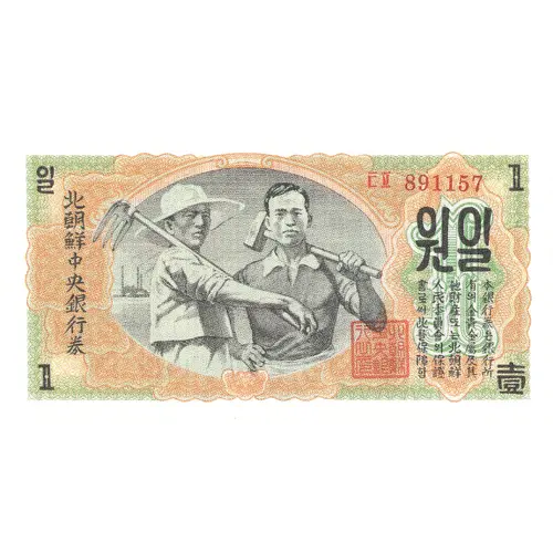 | Opis líce | 北朝鮮中央銀行券 원일 本銀行券은銀行所有의金貴金屬及其他財產또는北朝鲜人民委員會의保證書로써此를保障함 (Translation: Banknote of the Central Bank of North Korea, 1 Won, This banknote is also assured by the North Korean People`s Committee as well as gold, precious metals and other assets owned by the bank. (이 은행권은 은행소유의 금 귀금속 및 기타 재산또는 북조선인민위원회의 보장하다로써 이거를 확신함.)) |