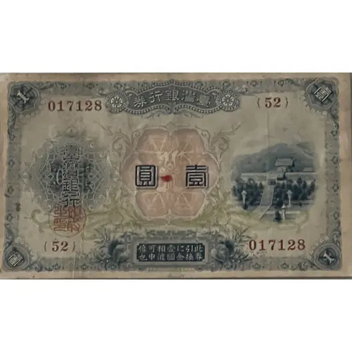 1 券行銀灣臺 壹 臺灣銀行 圓壹 壹 此券引換に圓相渡可申俟也 1 (Translation: Bank of Taiwan note 1 Bank of Taiwan One Yen In exchange for this note, a corresponding amount in yen shall be paid) |