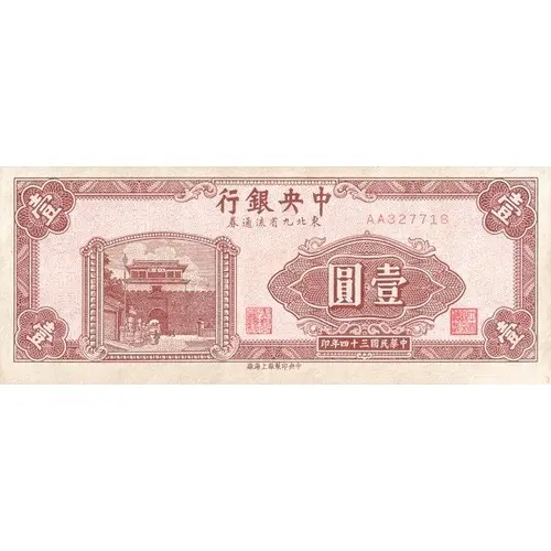 | Legenda awersu | 行銀央中 券通流省九北東 圓壹 印年四十三國民華中 廠海上廠製印央中 (Translation: Central Bank of China Circulation Notes in Northeastern 9 Provinces One Yuan Printed in the 34th year of the Republic of China Central Engraving and Printing Plant, Shanghai Factory) |