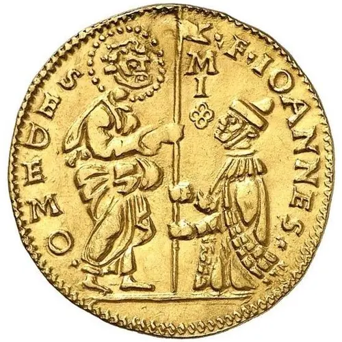 | Descripción del anverso | St. John standing to right, presenting the banner of the Order to the grand master kneeling to left. |