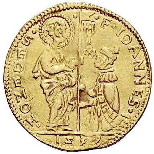 | Obverse description | St. John standing to right, presenting the banner of the Order to the grand master kneeling to left. |