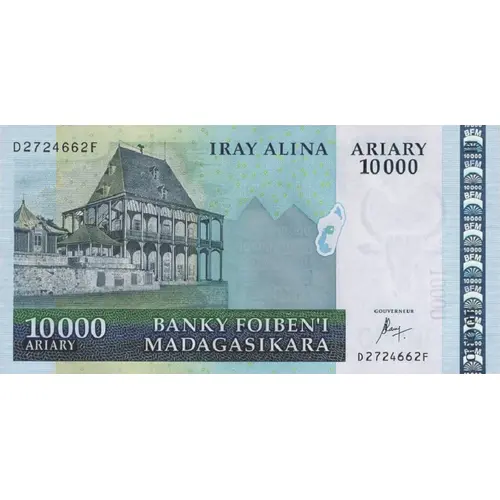 | Opis rubu | BANKY FOIBEN`I MADAGASIKARA IRAY ALINA ARIARY (Translation: Central Bank of Madagascar, Ten Thousand Ariary) |