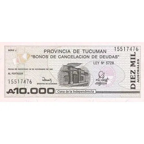| Legenda awersu | PROVINCIA DE TUCUMAN `BONOS DE CANCELACION DE DEUDAS` LEY N° 5728 FECHA DE CADUCIDAD 30 DE NOVIEMBRE DE 1991 AL PORTADOR DIEZ MIL AUSTRALES CUNA DE LA INDEPENDENCIA (Translation: PROVINCE OF TUCUMAN `DEBT CANCELLATION BONDS` LAW N ° 5728 EXPIRY DATE NOVEMBER 30, 1991 THE BEARER TEN THOUSAND AUSTRAL CRADLE OF INDEPENDENCE) |