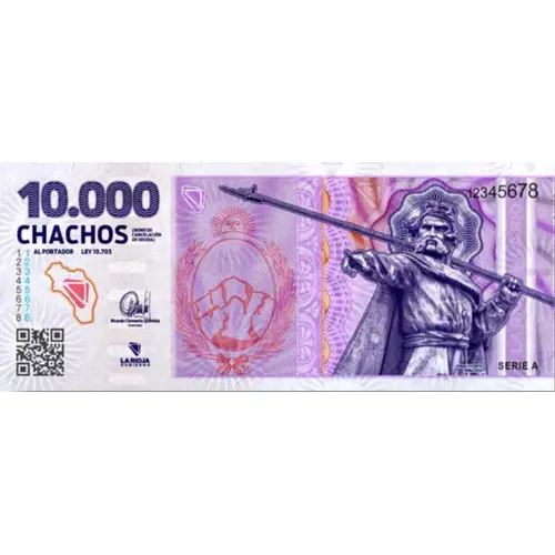 | Obverse lettering | 10.000 CHACHOS (BONO de CANCELACIÓN de DEUDA) AL PORTADOR LEY 10.703 LA RIOJA Gobierno Ángel Vicente Peñaloza (Translation: 10,000 CHACHOS (DEBT CANCELLATION BONUS) TO THE BEARER LAW 10,703 LA RIOJA Government Ángel Vicente Peñaloza) |
