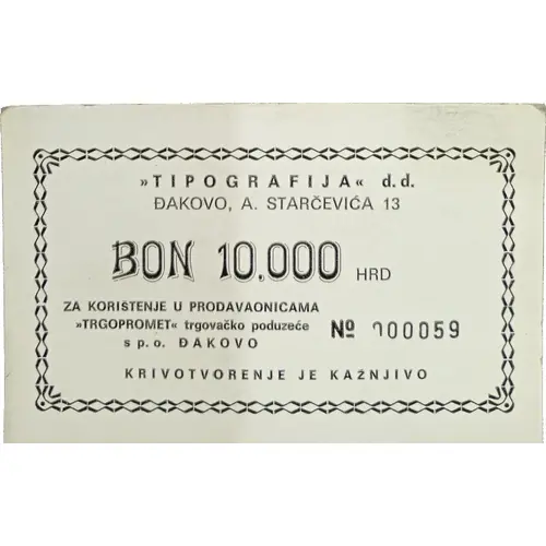 | Legenda del dritto | GRAFIČKO PODUZEĆE `TIPOGRAFIJA` Đakovo, A. STARČEVIĆA 13 BON 10.000 HRD ZA KORIŠTENJE U PRODAVAONICAMA `TRGOPROMET` trgovačko poduzeće s p. o. ĐAKOVO KRIVOTVORENJE JE KAŽNJIVO No. 000059 |