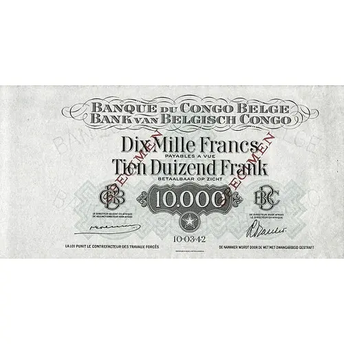 | Legenda del dritto | BANQUE DU CONGO BELGE BANK VAN BELGISCH CONGO DIX MILLE FRANCS PAYABLES A VUE TIEN DUIZEND FRANK BETAALBAAR OP ZICHT LA LOI PUNIT LE CONTREFACTEUR DETRAVAUX FORCES DE NAMAKER WORT DOOR DE WET MET DWANGARBREID GESTRAFT |