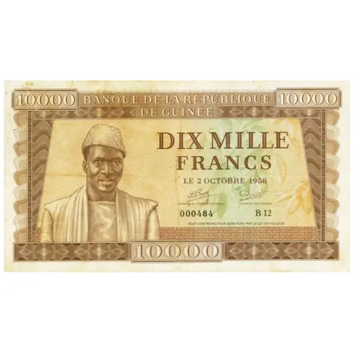 BANQUE DE LA RÉPUBLIQUE DE GUINÉE DIX MILLE FRANCS LE 2 OCTOBRE 1958 TOUT CONTREFACTEUR SERA PUNI PAR LA LOI EN VIGUEUR |