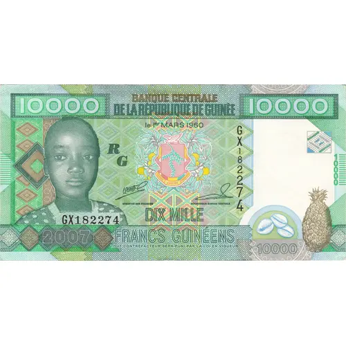 | Légende de l’avers | 10000 BANQUE CENTRALE DE LA REPUBLIQUE DE GUINEE DIX MILLE FRANCS GUINEENS |