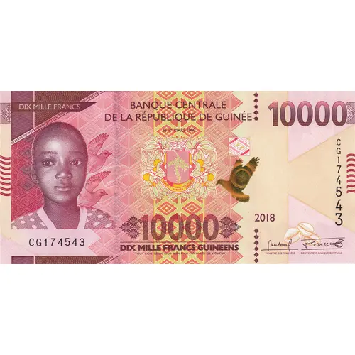 Banque Centrale de la République de Guinée. Dix Mille Francs Guinéens. Tout contrefacteur sera puni par la loi en vigueur. Le 1er Mars 1960. (Translation: Central Bank of the Republic of Guinea. Ten Thousand Guinean Francs. Any infringer will be punished by the applicable law. March 1, 1960.) |