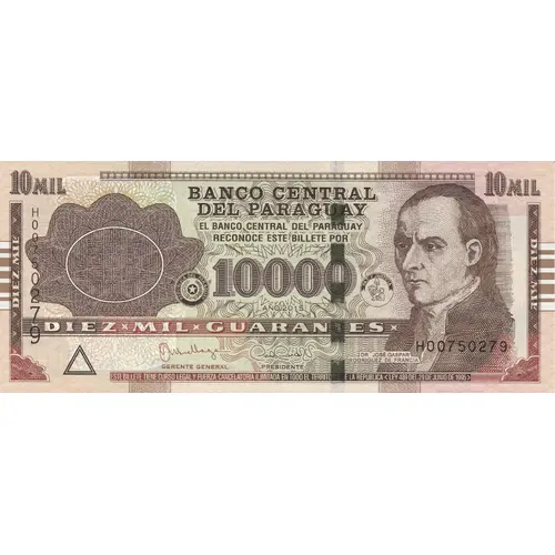 | Rückseitenlegende | 10000 REPUBLICA DEL PARAGUAY 10000 10000 10000 14 DE MAYO DE 1811 10000 PA SU GUARANI 10000 (Translation: Republic of Paraguay May 14th., 1811 Ten Thousand Guaranies (guarani language)) |
