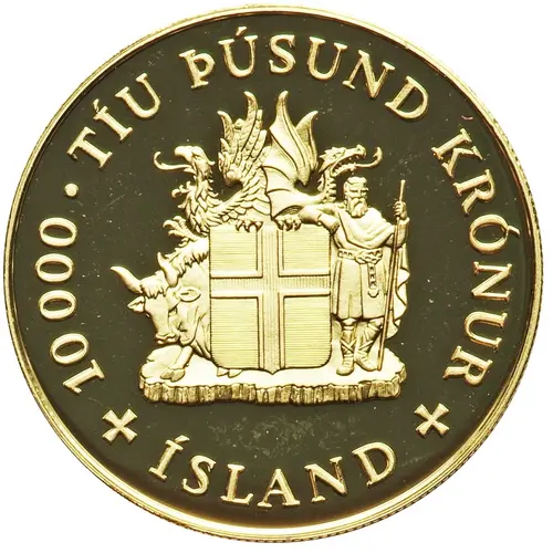| Opis awersu | Icelandic coat of arms surrounded by the four traditional protector spirits (`Landvættir`) of Iceland. These are Griðungur the bull, Gammur the eagle, Dreki the dragon, and Bergrisi the giant. |