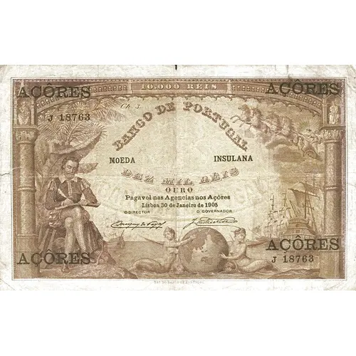 (Translation: 10,000 Reis Azores Bank of Portugal Island currency Ten Thousand Reis Gold Payable at agencies in the Azores Lisbon, January 30, 1905 Printer of Bank of Portugal)