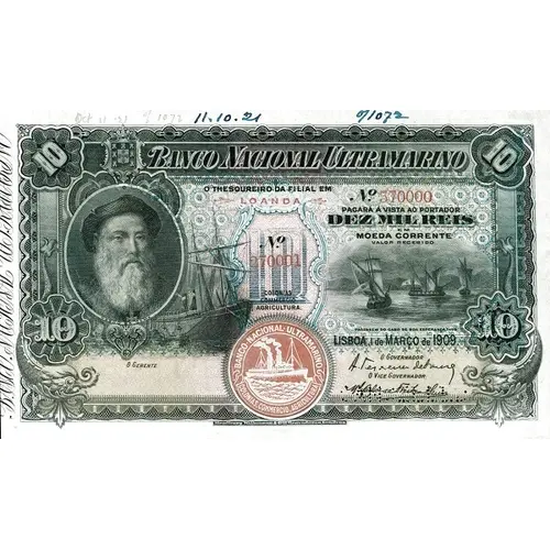 | نوشتههای روی اسکناس | BANCO NACIONAL ULTRAMARINO O THESOUREIRO DA FILIAL EM LOANDA PAGARÁ Á VISTA AO PORTADOR DEZ MIL REIS EM MOEDA CORRENTE VALOR RECEBIDO (Translation: National Overseas Bank, The Branch Treasurer in Luanda, Will pay the holder on sight ten thousand réis in current currency) |