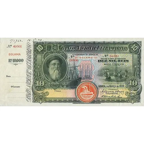 | Opis líce | BANCO NACIONAL ULTRAMARINO O THESOUREIRO DA AGENCIA DE BOLAMA PAGARA A VISTA A PORTADOR DEZ MIL REIS EM MOEDA CORRENTE VALOR RECIBIDO LISBOA, I DE MARÇO DE 1909. (Translation: National Bank Overseas the Treasurer of the Agency of Bolama pay to the bearer Ten Thousand Reis in currency amount received Lisbon, March 1, 1909.) |