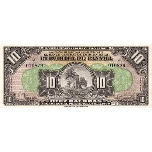 MONEDA FIDUCIARIA DE CURSO LEGAL CONSTE POR ESTE BILLETE QUE HAY DEPOSITADOS EN EL BANCO CENTRAL DE EMISION DE LA REPUBLICA DE PANAMA DIEZ BALBOAS PAGADEROS AL PORTADOR A SOLICITUD |