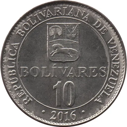 | نوشتههای روی سکه | REPÚBLICA BOLIVARIANA DE VENEZUELA. 2016. BOLÍVARES 10 (Translation: Bolivarian Republic of Venezuela. 2016. Bolívares 10) |