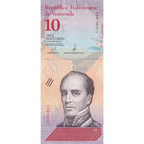 | نوشتههای روی اسکناس | República Bolivariana Venezuela Diez Bolívares 15 de enero de 2018 (Translation: Bolivarian Republic of Venezuela Ten Bolivares January 15, 2018) |