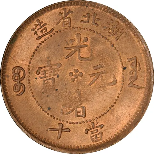 | Legenda del dritto | 造省北湖 ᠪᠣᠣ ᠶᡠᠸᠠᠨ 光 寶元 緒 十當 (Translation: Made in Hupeh Province Yuanbao (Original currency) Guangxu (Emperor) / Yuanbao (Original currency) Worth 10 Cash) |