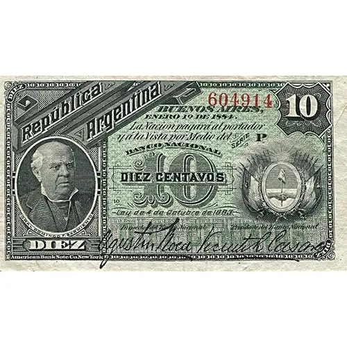 | Opis líce | República Argentina BUENOS AIRES, ENERO 1º DE 1884. La nación pagará al portador y á la Vista por Medio del BANCO NACIONAL 10 DIEZ CENTAVOS -Ley de 4 de Octubre de 1883.- GRAL DOMINGO F. SARMIENTO DIEZ (Translation: Republic of Argentina Buenos Aires, January 1st., 1884. The Nation will pay to bearer at sight through the National Bank Ten Cents Law of October 4, 1883.) |
