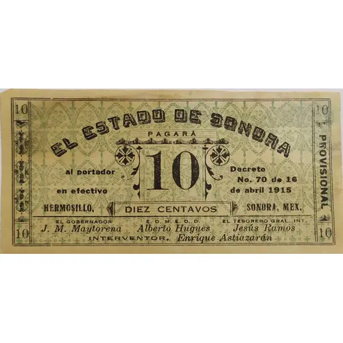 | Obverse lettering | El Estado de Sonora pagará en efectivo 10 centavos. Decreto No. 70 de 16 de abril 1915. Hermosillo, Sonora, Mex. (Translation: The State of Sonora will pay 10 cents in cash. Decree No. 70 of April 16, 1915. Hermosillo, Sonora, Mex.) |