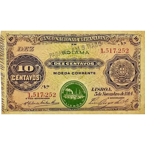 | Leyenda del anverso | BANCO NACIONAL ULTRAMARINO PAGÁVEL EM S. THIAGO DEZ CENTAVOS EM MOEDA CORRENTE LISBOA, 5 de Novembro de 1914. (Translation: National Bank Overseas Payable in St. Thiago Ten Cents in Currency Lisbon, November 5, 1914.) |