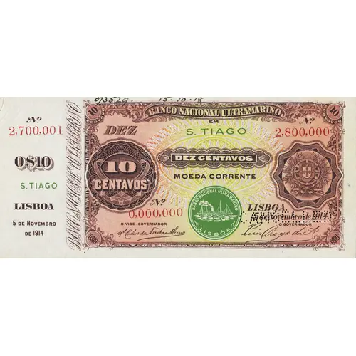 | Надписи лицевой стороны | BANCO NACIONAL ULTRAMARINO EM S. TIAGO DEZ CENTAVOS MOEDA CORRENTE LISBOA, 5 de Novembro de 1914. Bradbury, Wilkinson & Co. Ld. Gravadores, Londres (Translation: National Bank Overseas in St. Tiago Ten Cents in Currency Lisbon, November 5, 1914. Bradbury, Wilkinson & Co. Ltd. Engravers, London) |