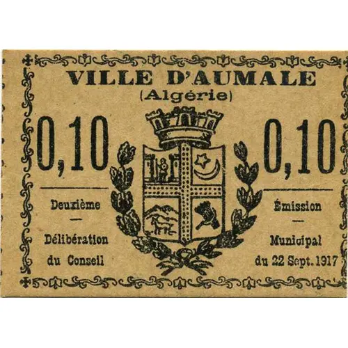 | Obverse lettering | VILLE D`AUMALE (Algerie) 0,10 Deuxième Emission Délibération du Conseil Municipal du 22 Sept. 1917 |