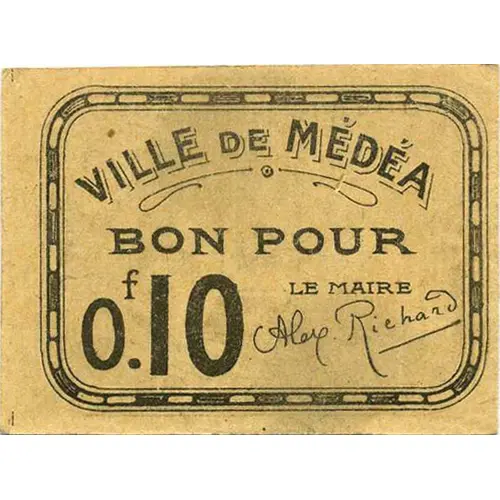 | Legenda do anverso | VILLE DE MEDEA BON POUR 0.f10 LE MAIRE |
