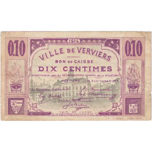 0,10 0,10 1914 VILLE DE VERVIERS BON DE CAISSE DIX CENTIMES REMBOURSABLES LORS DU RÉTABLISSEMENT NORMAL DE LA SITUATION. VERVIERS, LE 15 SEPTEMBRE 1914 Le Secrétaire Communal, Le Bourgmestre, (signature) (signature) L`Echevin des Finances, (signature) VOIR AU VERSO LE CARACTÈRE D’AUTHENTICITÉ CH. VINCHE VERVIERS |