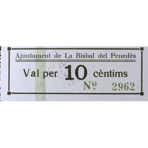 | 正面铭文 | Ajuntament de La Bisbal del Penedès Val per 10 cèntims (Translation: City Council of La Bisbal del Penedès Voucher for 10 Centimos) |