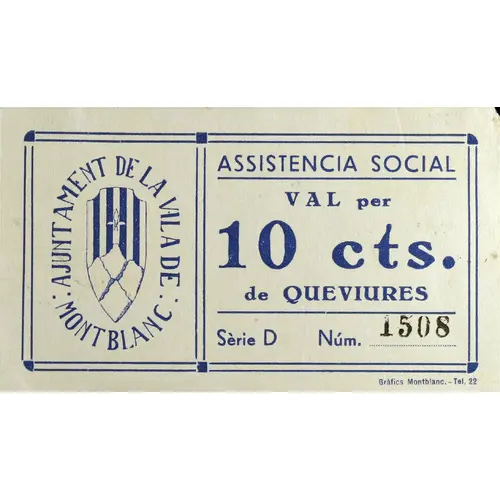 | Obverse lettering | AJUNTAMENT DE LA VILA DE MONTBLANC ASSISTENCIA SOCIAL VAL per 10 cts. de QUEVIURES (Translation: City Council of the village of Montblanc Voucher for 10 Centimos of groceries) |