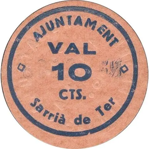 | Ön yüz lejandı | AJUNTAMENT Sarrià de Ter VAL 10 CTS. (Translation: City Council Sarrià de Ter Voucher 10 Centimos) |