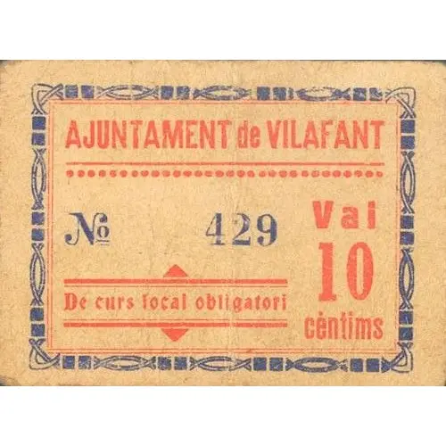 | نوشتههای روی اسکناس | AJUNTAMENT DE VILAFANT Val 10 cèntims De curs local obligatori (Translation: City Council of Vilafant Voucher 10 Centimos Mandatory local course) |