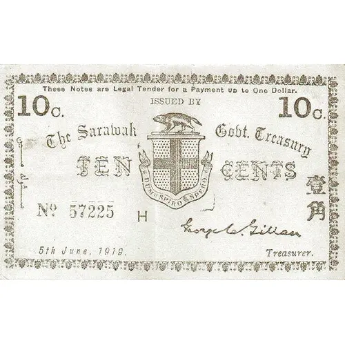 | Obverse lettering | THESE NOTES ARE LEGAL TENDER FOR THE PAYMENT OF UP TO ONE DOLLAR ISSUED BY THE SARAWAK GOVT. TREASURY TEN CENTS |