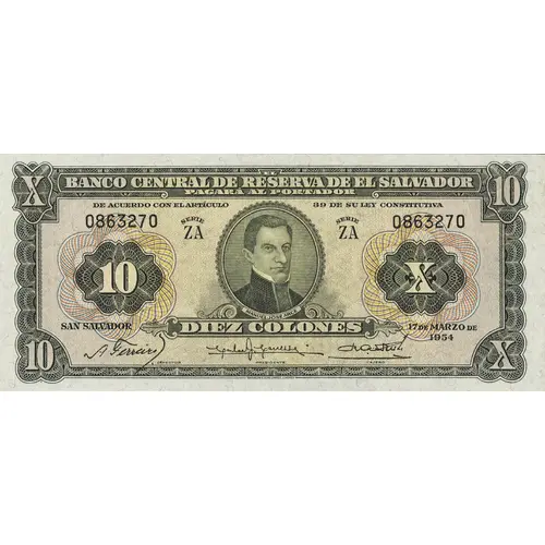| Obverse lettering | BANCO CENTRAL DE RESERVA DE EL SALVADOR PAGARÁ AL PORTADOR DE ACUERDO COM EL ARTÍCULO 39 DE SU LEY CONSTITUTIVA 10 X DIEZ COLONES SAN SALVADOR, 17 DE MARZO DE 1954. (Translation: Central Reserve Bank of El Salvador Pay to Bearer in according with article 39 of Constitutional Law Ten Colons San Salvador, March 17, 1954.) |