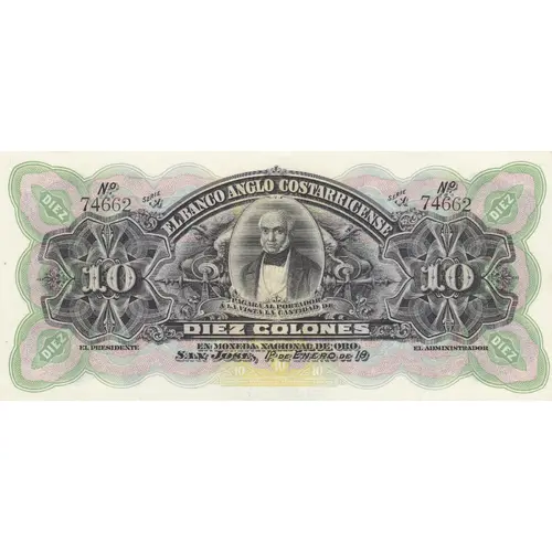 | Vorderseitenlegende | Serie A EL BANCO ANGLO COSTARRICENSE PAGARÁ AL PORTADOR A LA VISTA LA CANTIDAD DE DIEZ COLONES EN MONEDA NACIONAL DE ORO SAN JOSÉ, 1° DE ENERO DE 19 EL PRESIDENTE EL ADMINISTRADOR Bradbury Wilkinson y C° Grabadores, Londres |