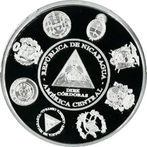 表面の銘文 REPÚBLICA DE NICARAGUA DIEZ CÓRDOBAS AMÉRICA CENTRAL REPUBLICA DE PARAGUAY REPÚBLICA DE NICARAGUA AMÉRICA CENTRAL LIBERTAD 15 DE SEPTIEMBRE DE 1821